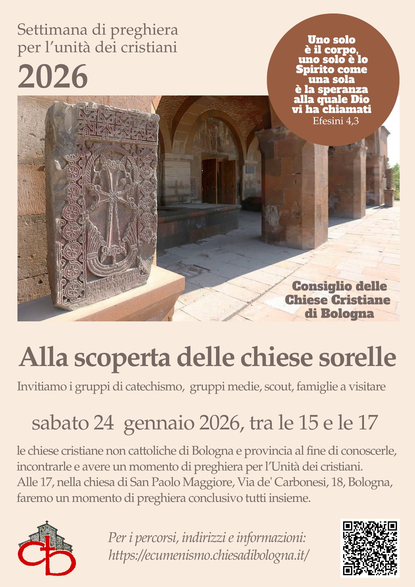 Anche quest’anno invitiamo i gruppi di catechismo, gruppi medie, scout, famiglie a visitare, sabato 24 gennaio 2026 tra le 15 e le 17, alcune chiese non cattoliche o cattoliche di rito bizantino di Bologna o provincia al fine di conoscerle, incontrarle e avere un momento di preghiera per l’Unità dei cristiani.