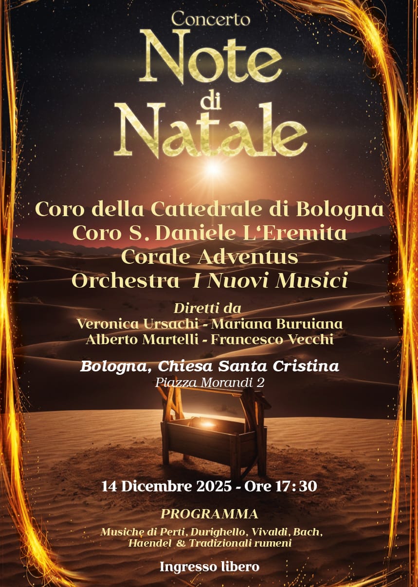 BOLOGNA – Il concerto si terrà domenica 14 dicembre 2025, alle ore 17.30, presso la Chiesa di Santa Cristina, Piazza Morandi 2 a Bologna. L’evento vedrà la partecipazione di: il Coro della Cattedrale di Bologna (Chiesa Cattolica), il Coro “San Daniele l’Eremita” (Chiesa Ortodossa), la Corale “Adventus” (Chiesa Avventista), accompagnati dall’orchestra “Nuovi Musici”. La direzione artistica sarà affidata a Veronica Ursachi, Mariana Buruiana, Alberto Martelli e Francesco Vecchi.