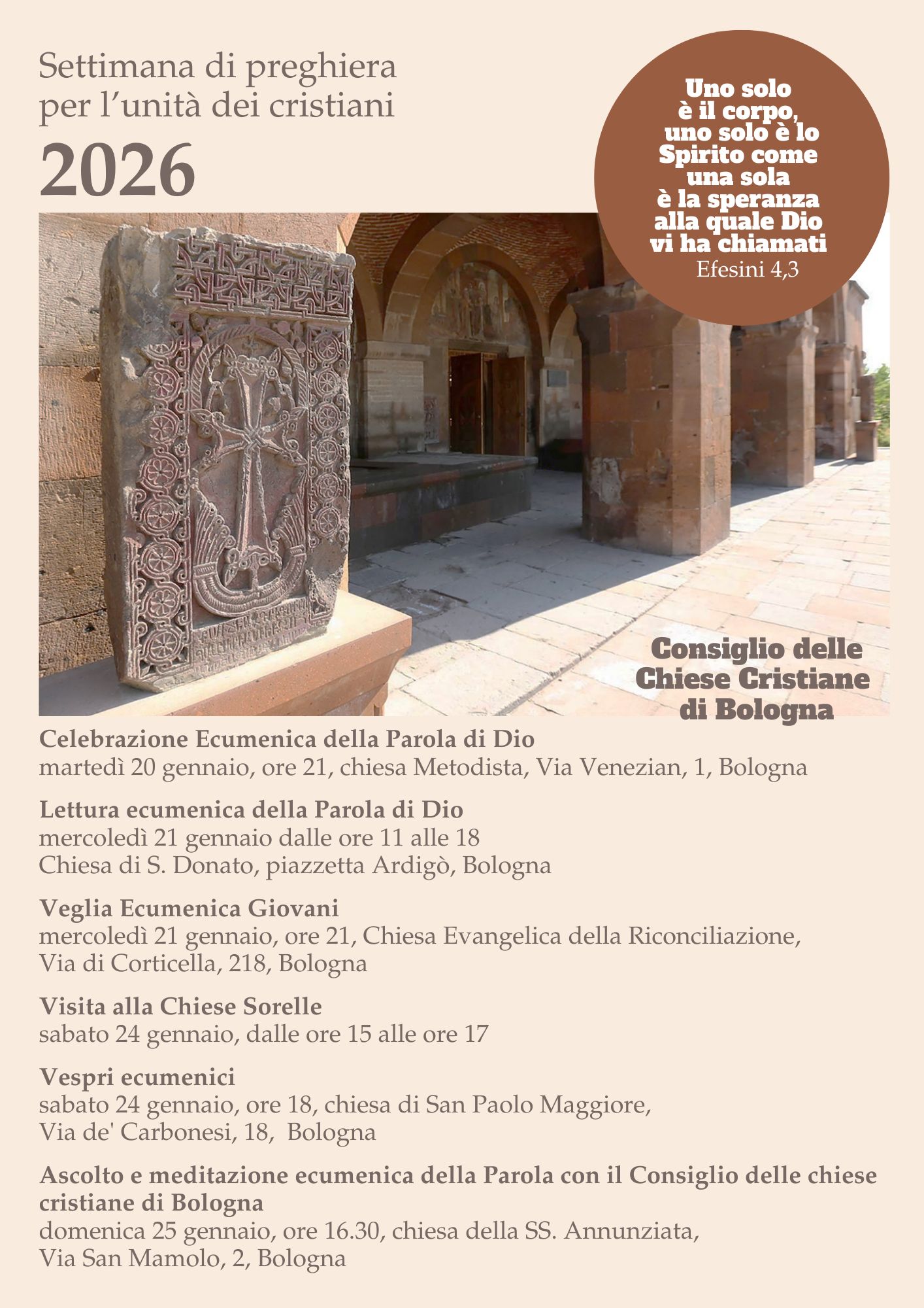 - Celebrazione Ecumenica della Parola di Dio, martedì 20 gennaio, ore 21, chiesa Metodista, Via Venezian, 1, Bologna. (Scarica il libretto)